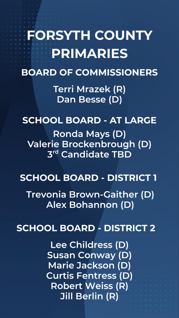 Greater Winston Salem Inc. extends an earnest congratulations to all of the winners from this week’s primary. Our organization is proud of the relationships we have with our entire elected delegation and their commitment to making Winston Salem/Forsyth County the best place to live, work, and locate. We look forward to working with all of you in the future. In the meantime, we will provide critical content for our members ahead of the general election in November to help our community have access to pertinent information about candidates and their platforms. Here is a quick snapshot of the primary results.